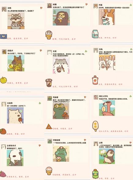 带图差评:树懒—巧克力甜筒、浣熊—速冻汤圆、企鹅—雪碧、棕色狼—香蕉、宅蛤蟆—妙脆角、田园犬—青苹果、八字法斗—可乐、穷酸蛤蟆—草莓甜筒、独眼蝴蝶犬—西瓜、古老牧羊犬—葡萄。
