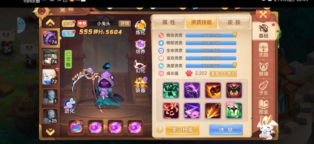 接下来就是我第二只主力,没钱培养的小猫,他是我第一个珍兽,可惜小鬼头比他厉害太多了,于是乎他就成了替补大哥,别说我没培养他,我还给她升到了74呢,他经常没出手就嗝屁了,因为我给他的是全智力,所以基本都是最后一个,我保证以后有钱了肯定给他多带俩个兽魂(人工狗头)