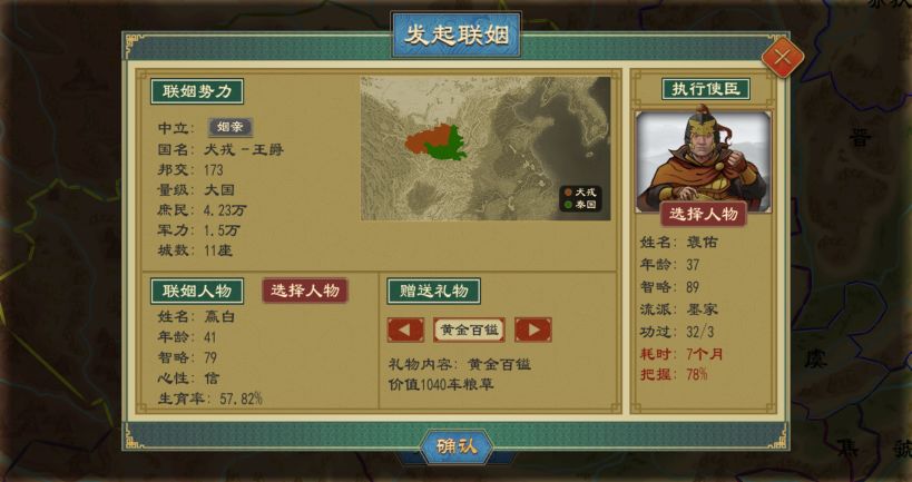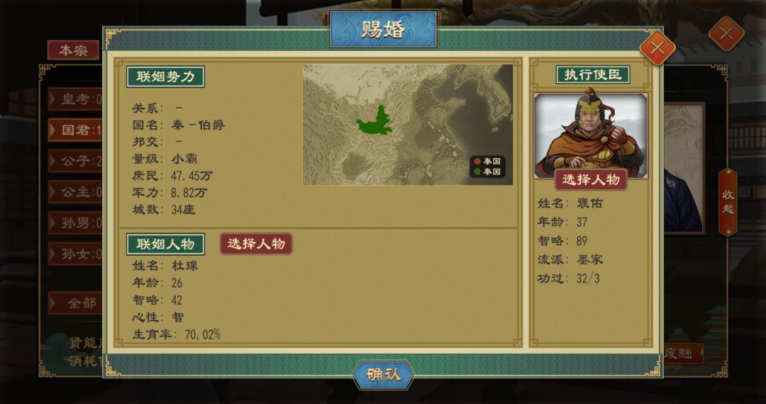 ●若需要与他国联姻,则需在目标国家或目标国家城邑界面选择【联姻】,派出使节提出联姻,并进行一系列礼制相关进程后完成婚配