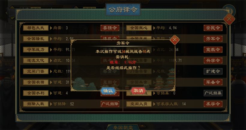 当厌战过高时,最快捷的方法是使用公府律令内的 【劳军令】 ,消耗部分粮草降低厌战。除此之外也可以通过停止战争、对厌战过高城邑进行免税等方式来降低厌战。