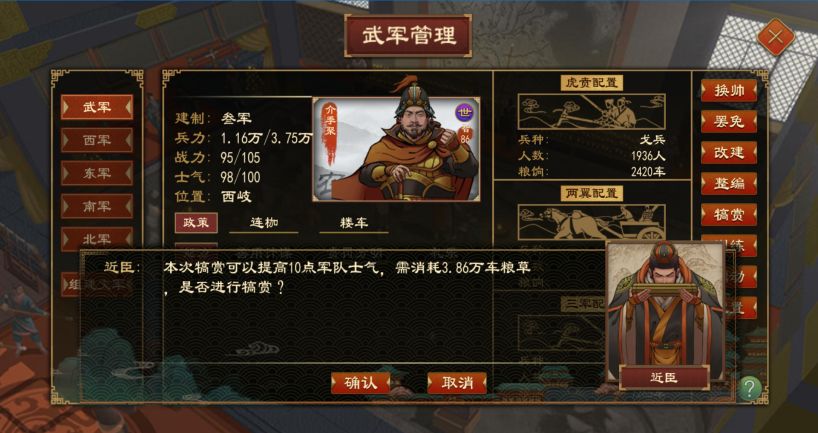 军队的战力与士气会影响作战表现,战力与士气越高,作战能力越强。在军队空闲时,可以进行 训练和犒赏 操作,保持军队战斗力,以便随时应战。