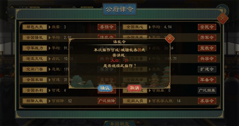当骚乱过高时,最快捷的方法是使用公府律令内的 【诛乱令】 ,消耗部分人口降低骚乱。除此之外也可以通过对骚乱过高城邑进行免役、免税,或者使用部分政策降低骚乱。