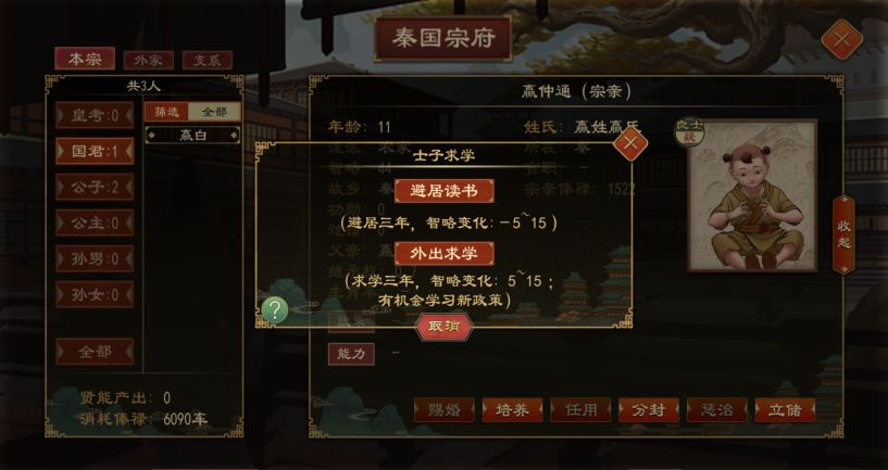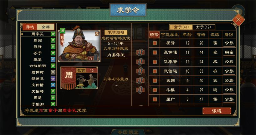 智略在游戏中是比较重要的设定,不同职位人物的智略高低影响了贤能产出、人才吸引力、谍战能力、军队战力等各个方面。求学有机会提高人物智略,在人才幼年时将其派出求学可以为后续人物担任职务提供更坚实的基础。
