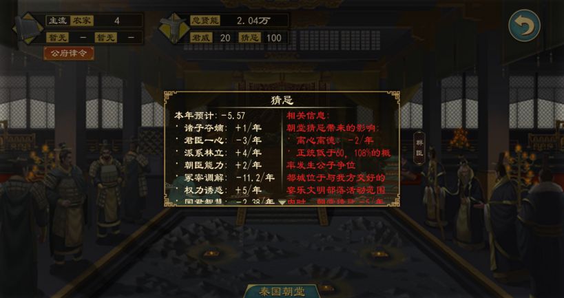 猜忌值升降的主要因素为更换朝臣、冢宰能力、朝臣流派数量、朝臣位置空缺、国君智慧、国君性格等,猜忌过高会产生部分负面效果,以及出现朝臣争吵等情况。当猜忌过高时,可以通过 宴请、参与辩论、减少朝堂朝臣思想流派数量、更换维稳能力更高的冢宰 等方式来有效降低猜忌。同时在朝堂内点击猜忌也会显示本年预计猜忌值变化,方便进行有效应对。