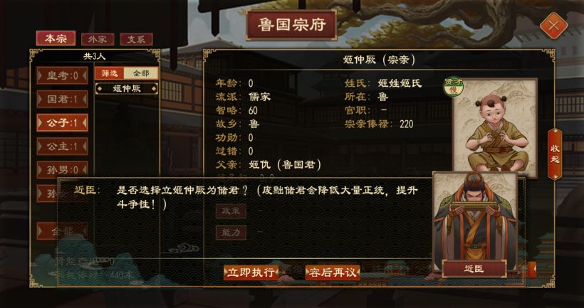 在 “都城-宫廷-儿女-人物详情” 中可以选择合适的子嗣进行立储, 废储将会产生负面影响 。
