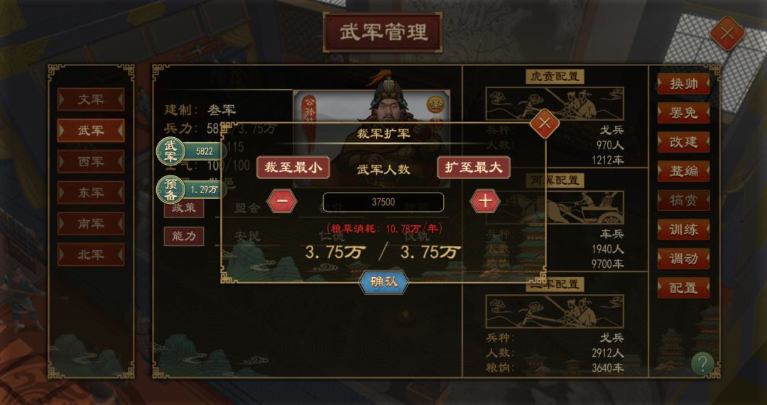 国土扩大时,会受到多个方位国家的威胁。当同时向多个国家宣战或者同时被多个国家宣战时,仅一两支军队是远远不够的,所以需要在战争之前进行军队组建。游戏内最多可同时拥有六支军队,在军队界面可以进行组建或者扩建,以及军队整编。