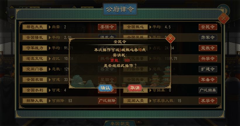 当叛心过高时,最快捷的方法是使用公府律令内的 【安民令】 ,消耗部分贤能值降低叛心。除此之外也可以通过对叛心过高城邑进行人口迁移、调低税率、减少隶工和预备役等方式来降叛心。
