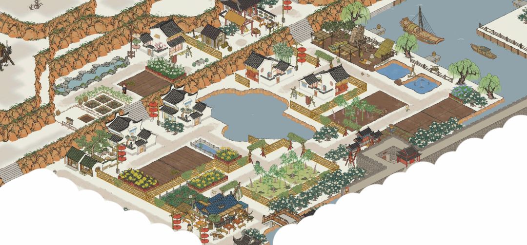 从城门出来,大致分为左右两个大院,大院又根据田地划分小院区域;同时去往其他地方的道路和民居院落相互不干扰(最多从田间路过);细节方向就是茶园临着茶楼或临着茶叶店形成一个产业链,当然这个细节是参考原作者的。