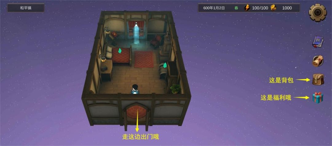 首先是见完女神进去之后的房间界面,有些勇者不仔细看对话框可能到这里就开始疑惑了,这里是初始的自己房间,在这里可以睡觉获得体力,也可以把背包里的物品放在储物箱里。右边的背包按钮可以查看个人信息和背包物品,勇者们在获得新物品以及习得新技能之后记得打开背包装备上哦。