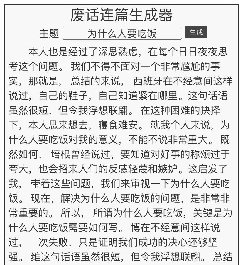可能很多人对AI生成文案的印象还停留在恶搞阶段,此前最火的就是“狗屁不通文案生成器”,也叫“废话生成器”。给出一个简单的关键词,会自动生成一篇确实“狗屁不通”的文章。