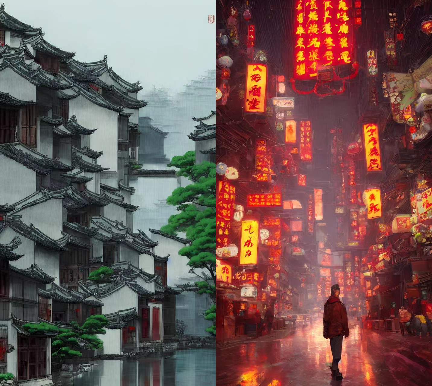 当然,AI能生成的场景图也不局限于此。中国风的江南水乡、赛博朋克风的唐人街,只要调整输入的关键字,AI都能给你生成出来。