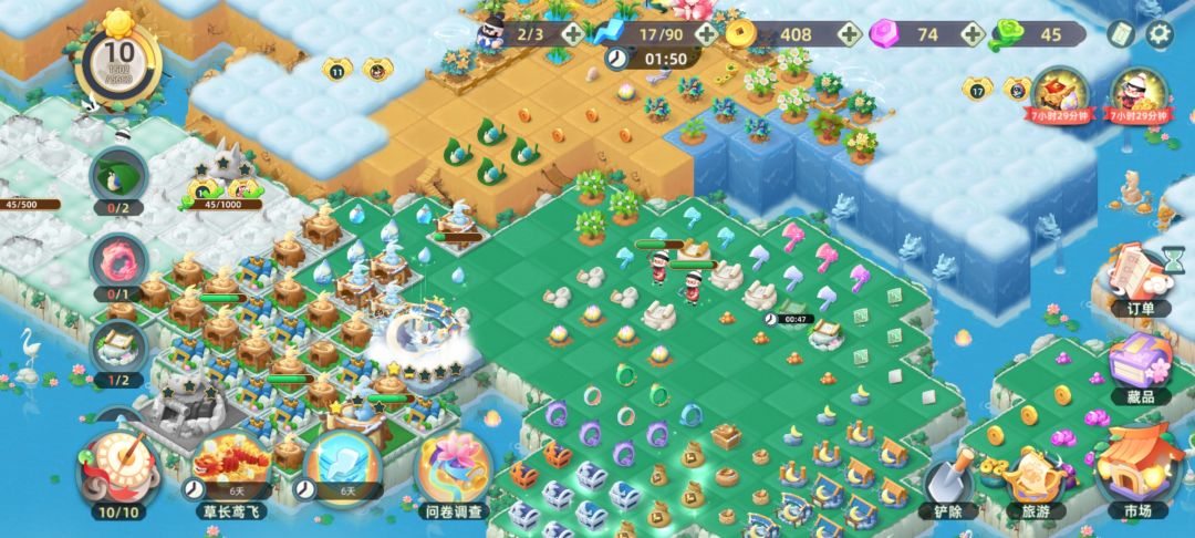 合合岛这边,采集需要时间,建筑需要时间,等待作物恢复也需要时间,体力需要等而且极度不够用(别说什么活动,我活动签到拉满+氪金体力/岛+全部金币买体力依旧不够),时间卡的也挺烦,但没有体力那么严重,不知道后期建筑阶高后会不会更漫长,这都是其它合成游戏体验不到的。
