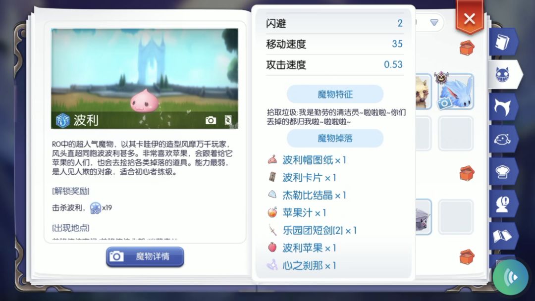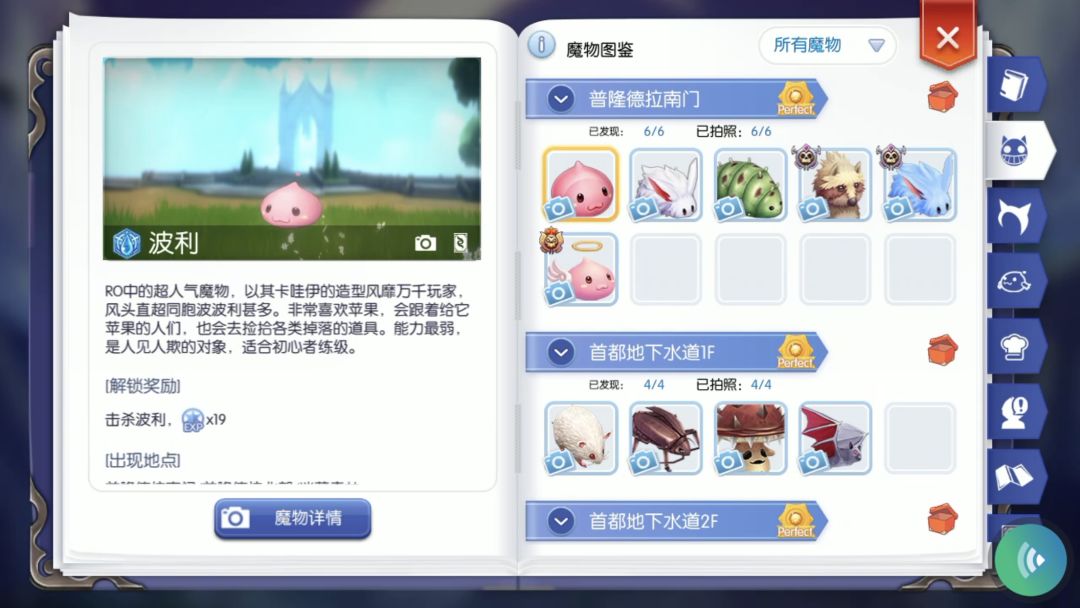 想知道野外怪物或MVP的相关属性和掉落物品等详情,对着它一通乱拍即可!拍照完成后打开冒险手册魔物篇,点击魔物详情查看~
