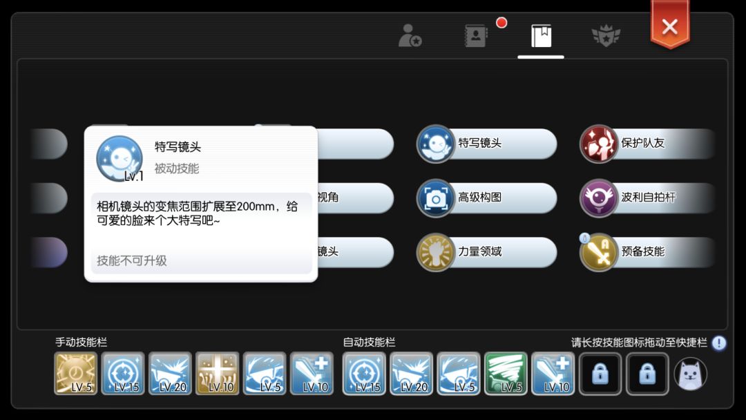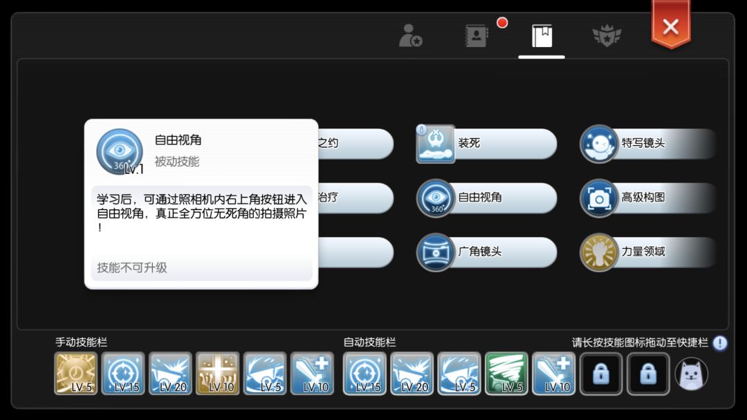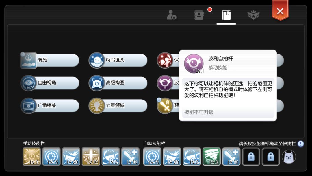 获取照相机后,仅开通了拍照功能,如果需要更多选择,需要到冒险技能导师那里学习,以下为功能全开的界面,总的来说,如果你是拍照爱好者,全开便行!