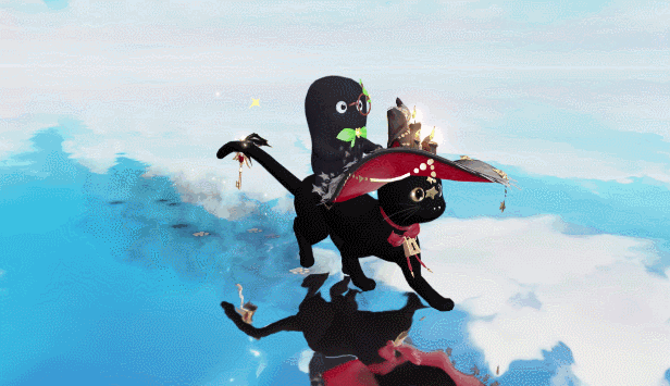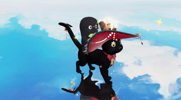 一只活泼可爱的异瞳黑色灵猫,颈间环绕着红色蝴蝶结和金色锁链。修长的尾巴上悬挂着精致的红色桃心钥匙。黑红色设计的帽子和【绯夜华章】时装搭配的相得益彰,帽檐有流星花纹和烛火做装饰,有这样一只乖巧神秘的坐骑,菌菌觉得自己在三界横行霸道指日可待!