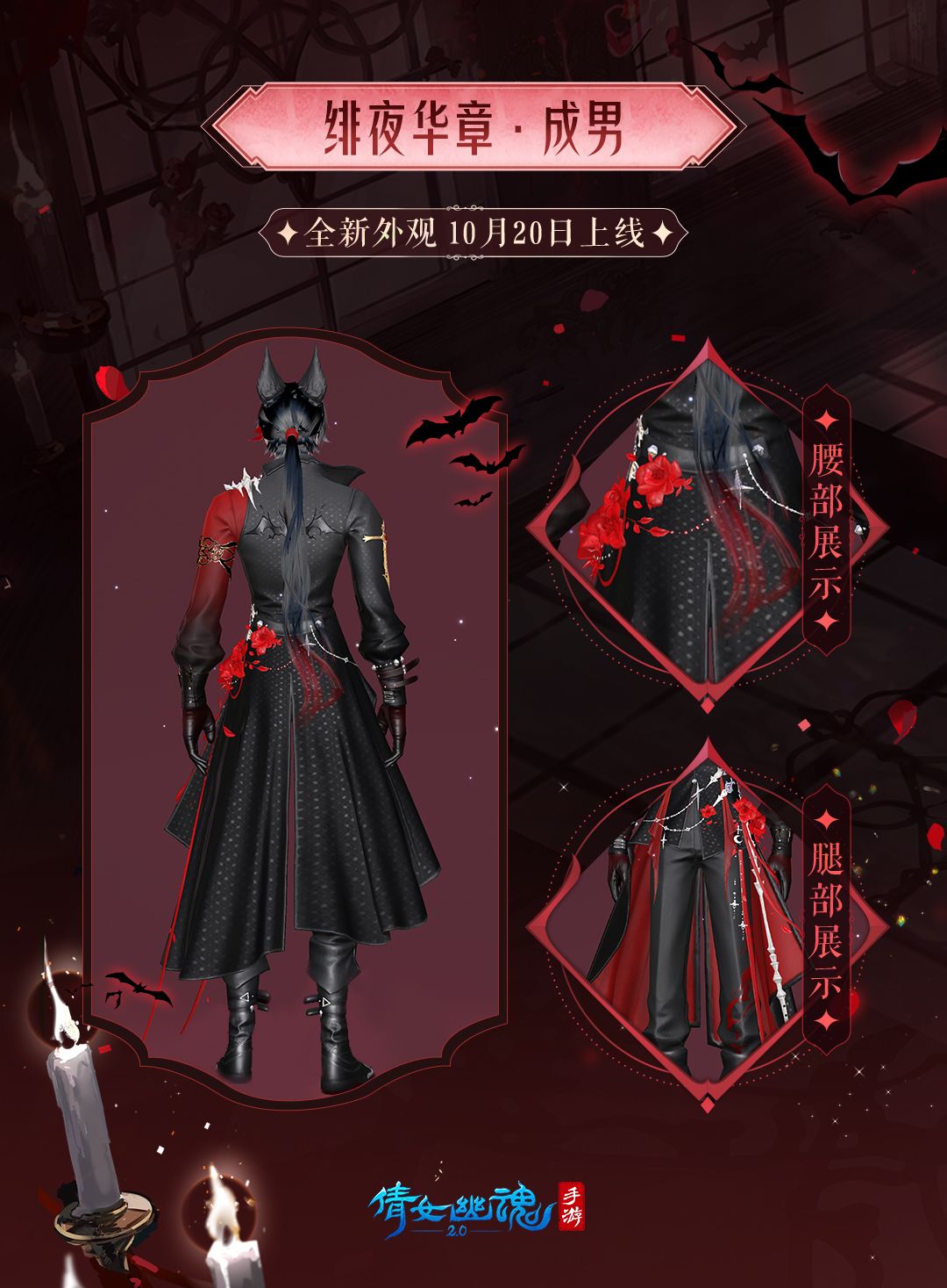 男款【绯夜华章】也使用黑色作为主基调,搭配红色系内衬,尤显暗夜贵公子之感。长款西装上配有鎏金和纯银装饰,几朵玫瑰花瓣点缀在腰间。黑色骑士裤搭配长靴更显身形修长。