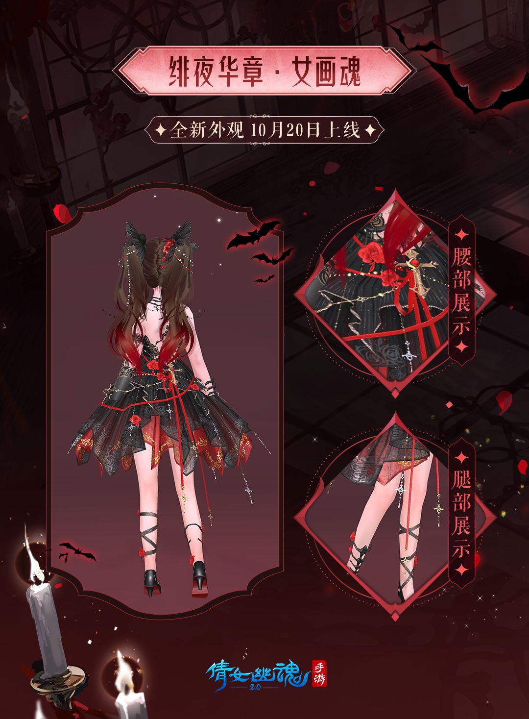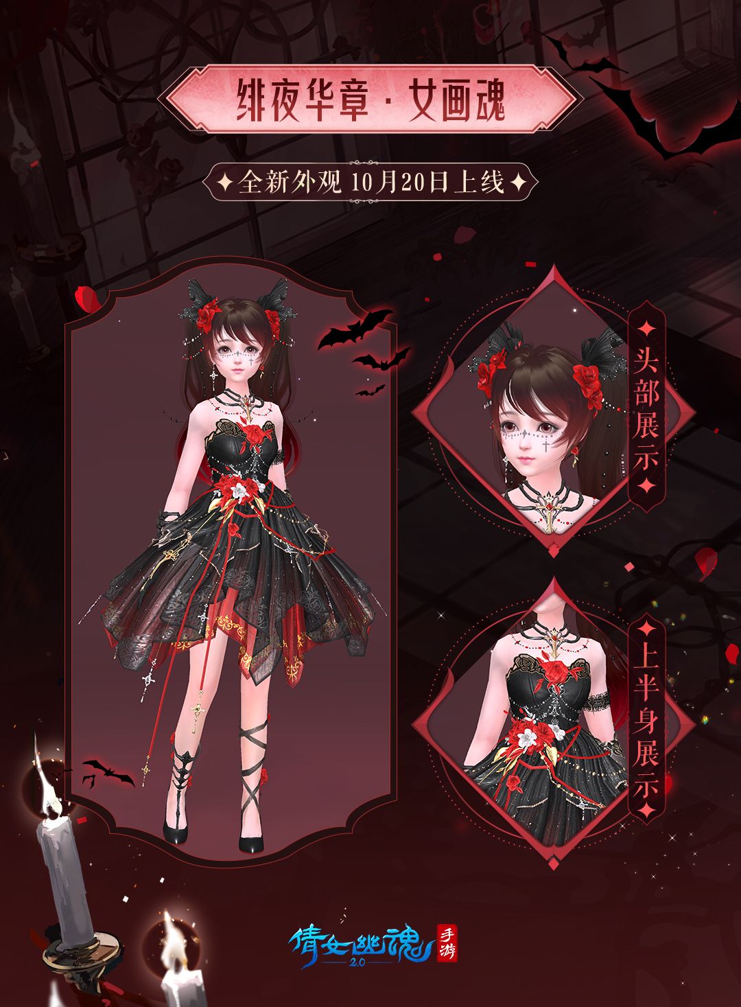 女画魂的【绯夜华章】时装延续了以往俏皮灵动的风格,黑红色蓬蓬纱裙上系着用玫瑰和鎏金饰品做点缀的红绳,绑带高跟鞋更显活泼。