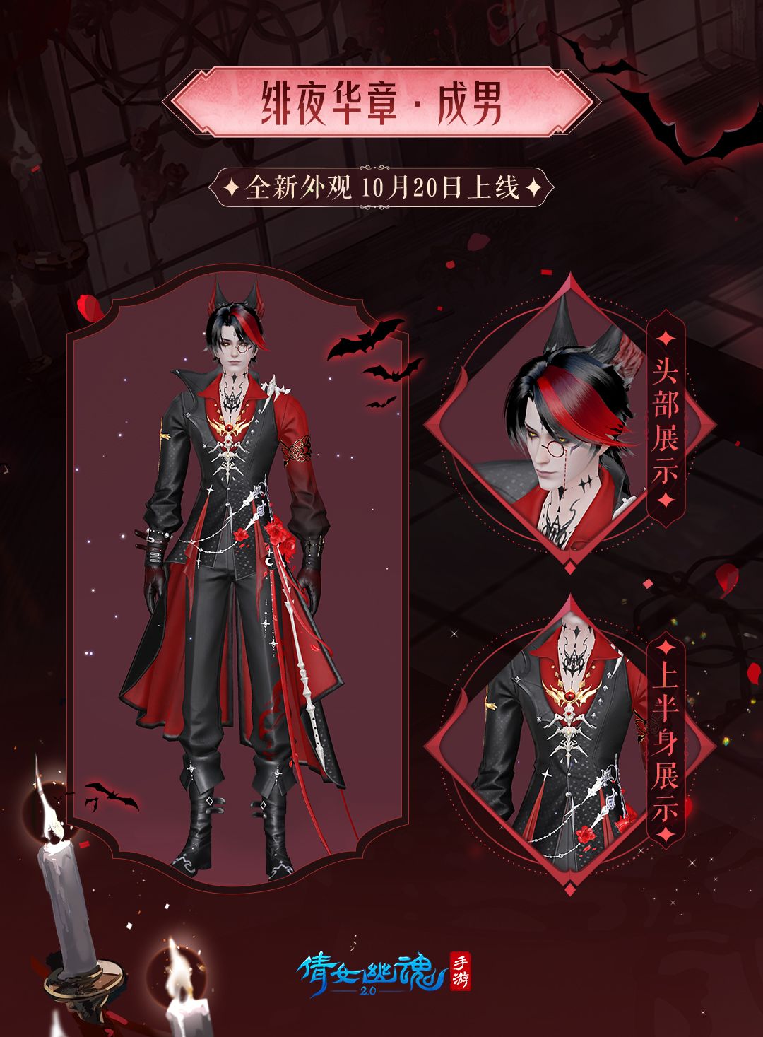 发饰采用猫耳设计,红色系挑染以及长马尾的发型为整身时装增添了一抹俊朗。黑红色皮手套和胸前的蝙蝠图案让男款时装魅力值拉满。