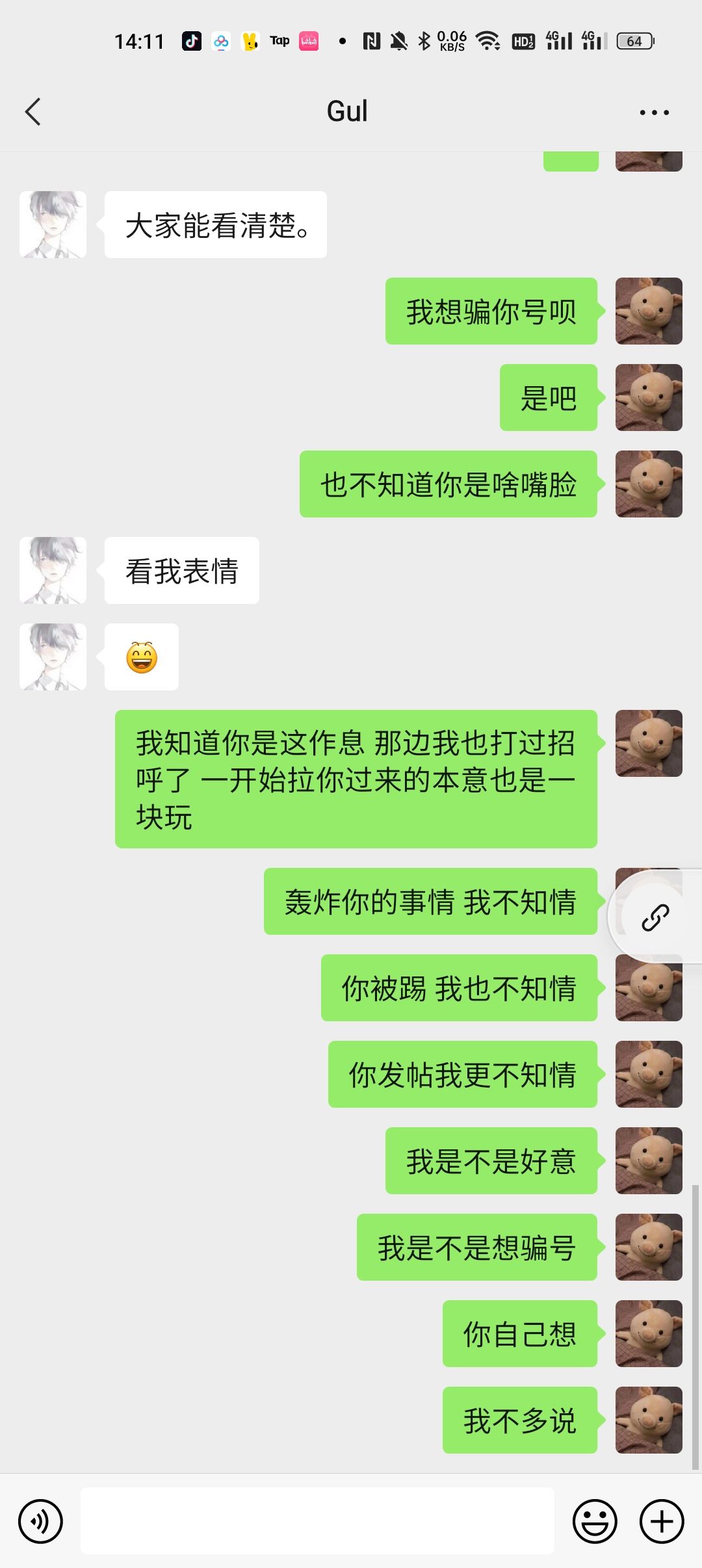我先为我没有在公会与其他的权限管理人打好招呼 向那个被踢的兄弟表示歉意 我本不想发声 我不是受害人 也不是施暴者 但是看到这么多兄弟在帮我发声 我还是决定站出来表达一下态度
