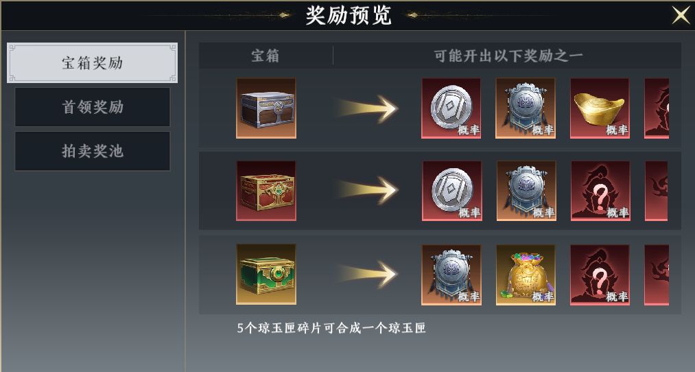 6.在第一关中采集到的纹银匣和鎏金匣,在活动结束后,开启可获得大量奖励;第二关中采集到的琼玉匣碎片,可以合成琼玉匣,开启后可以获得金将碎片等高价值奖励。不过宝箱和碎片都是有数量限制的,大家记得尽可能采集满哦~