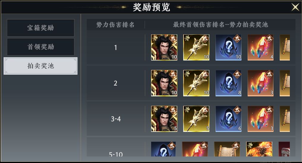 在第三个关卡中,进入势力伤害排行榜的势力,在活动结束后将开启势力拍卖。进入了活动第一关或者更多关卡的玩家,可以获得本势力的拍卖分红。