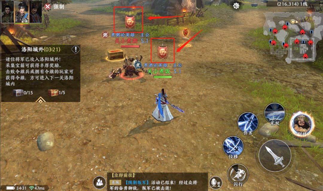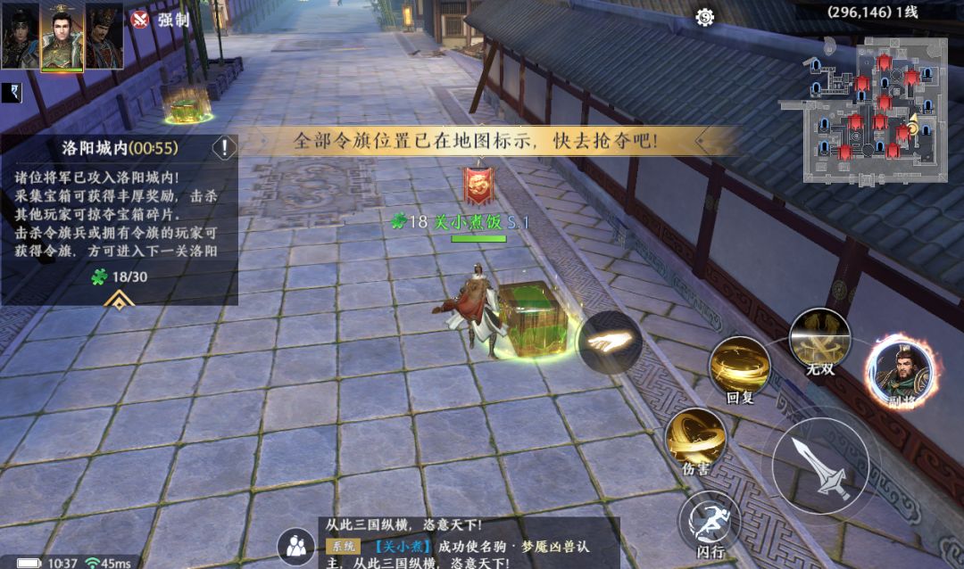 4.在倒数1分钟左右时,右上角小地图会显示当前所有令旗所在的位置。如果你还没获得令旗,记得抓住最后的机会;如果你已经获得了令旗,记得灵活走位,躲过他人的追击哦~