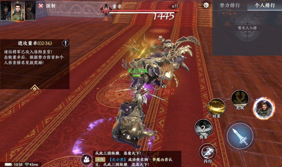 第三关为洛阳皇宫,这一关需要挑战BOSS董卓,同时会根据势力伤害、个人伤害进行排名,发放奖励。