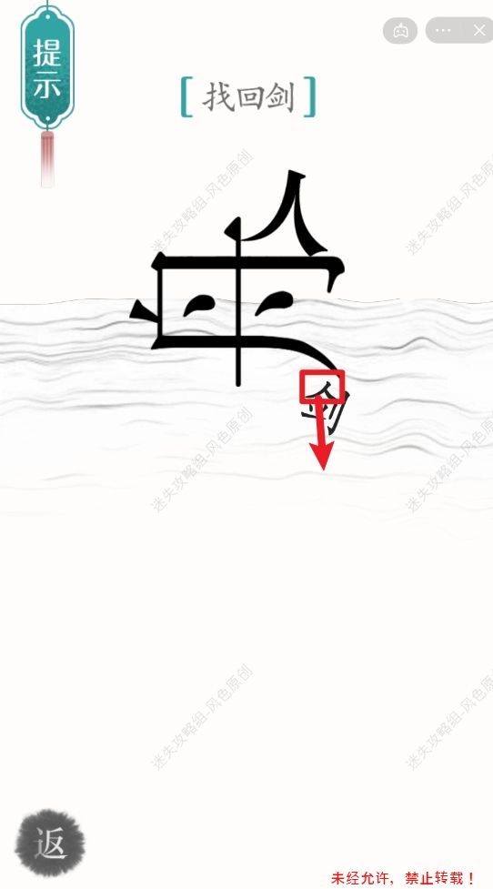 18.如下图所示,在剑掉下水中后,将剑字中的人字拖动到剑字的下方,让人字将剑送回到船上即可。18