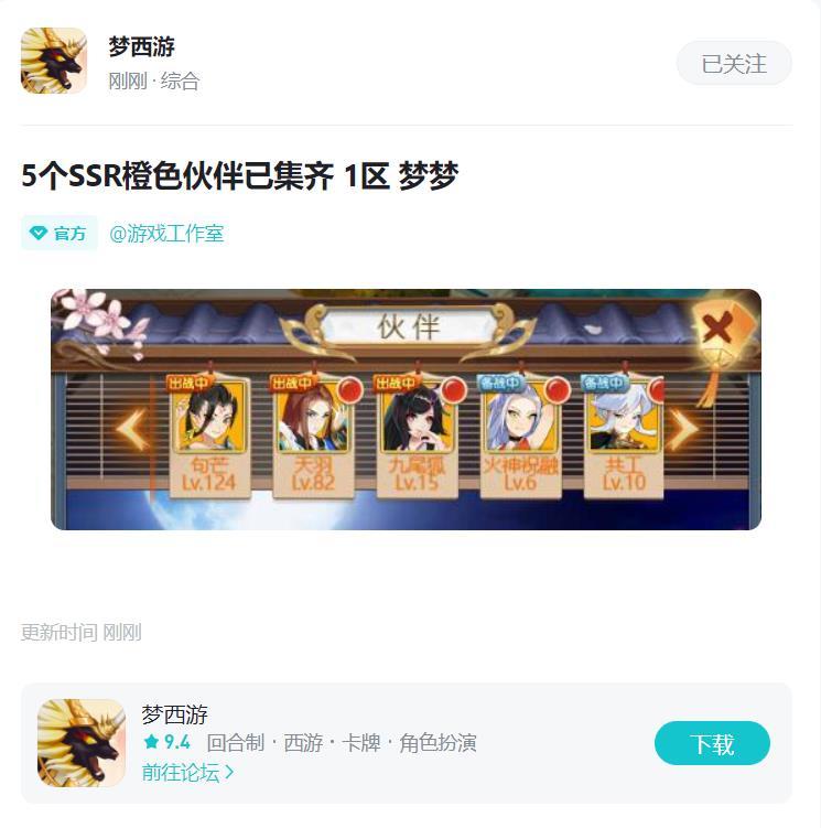 在《梦西游》论坛进行帖子发布,5个SSR集齐截图,并且标记你的区号角色名!格式:5个SSR橙色伙伴已集齐 区号+角色名