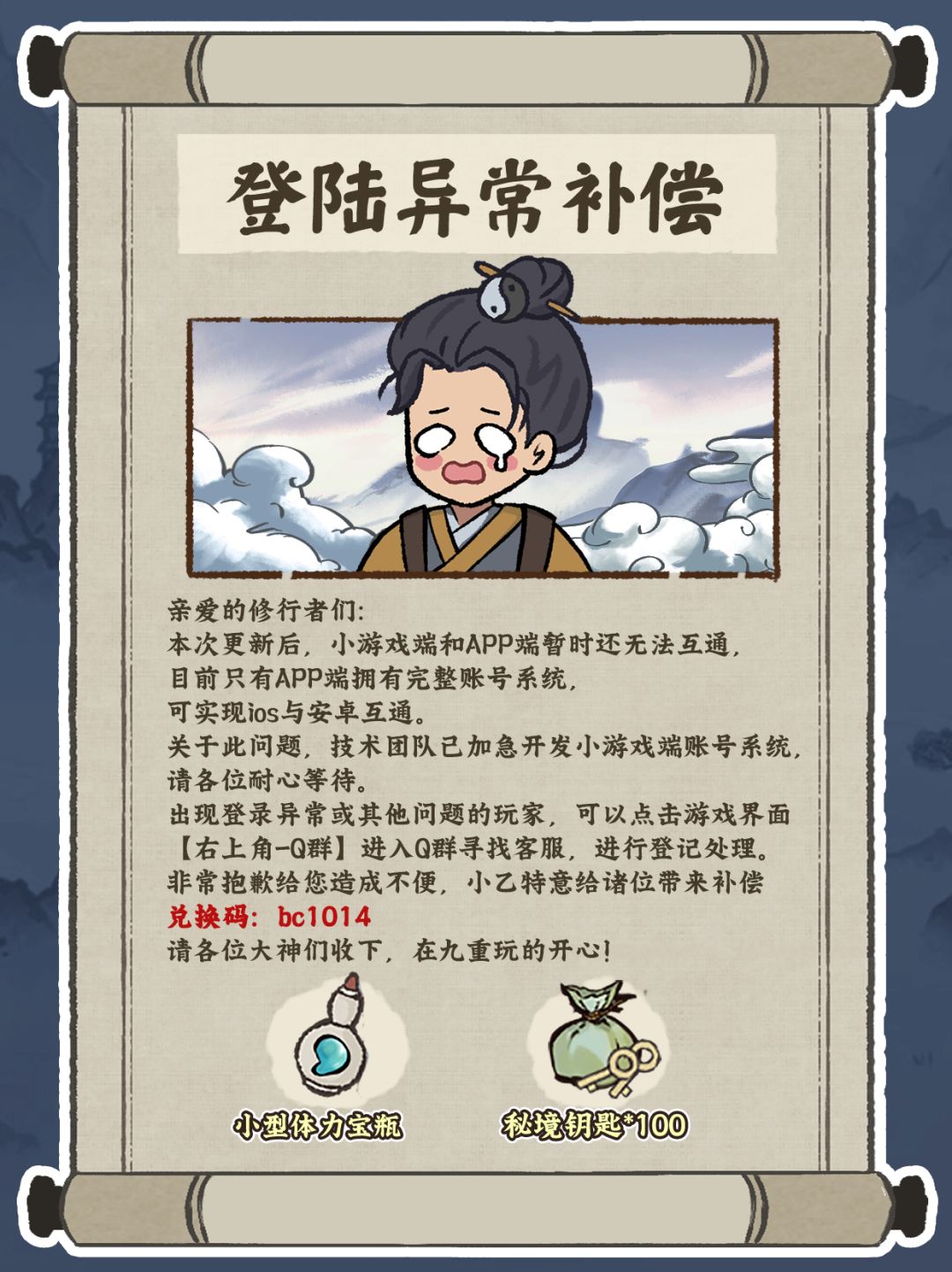 本次更新有部分玩家出现了登录异常等问题,在此向修行者们表达歉意,各位修行者可以使用兑换码在游戏内领取补偿。