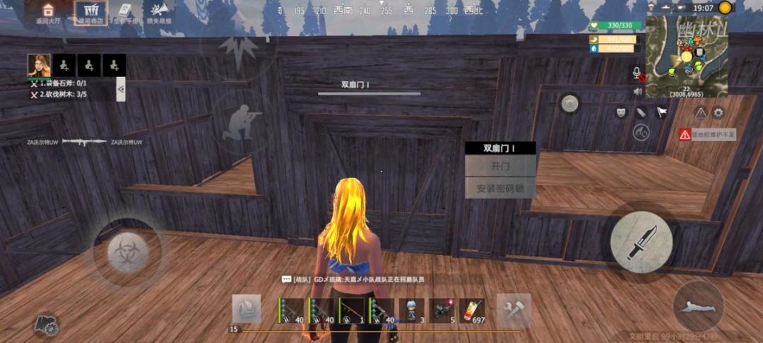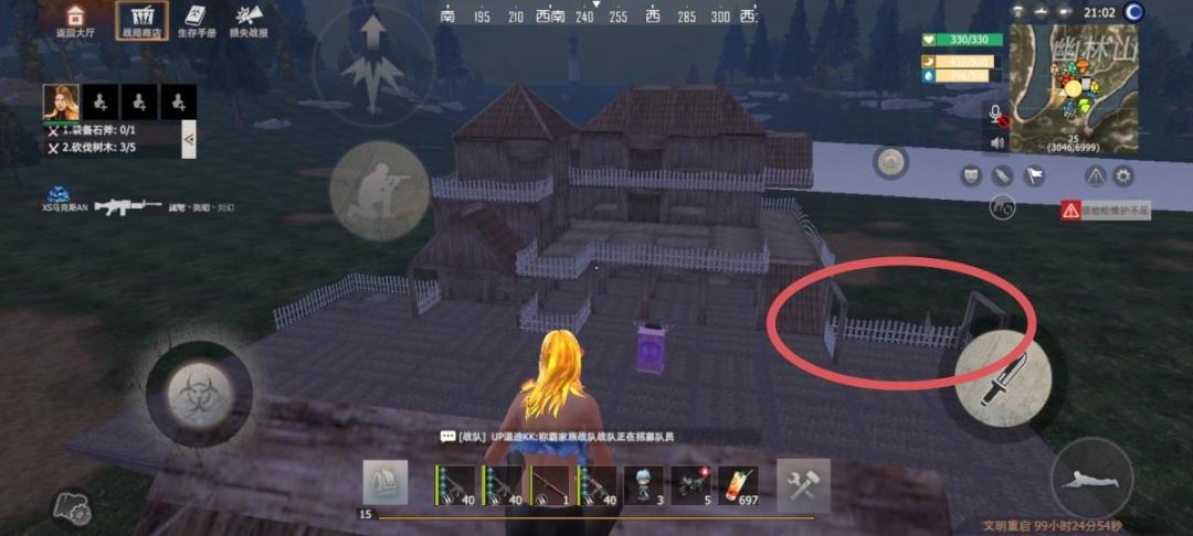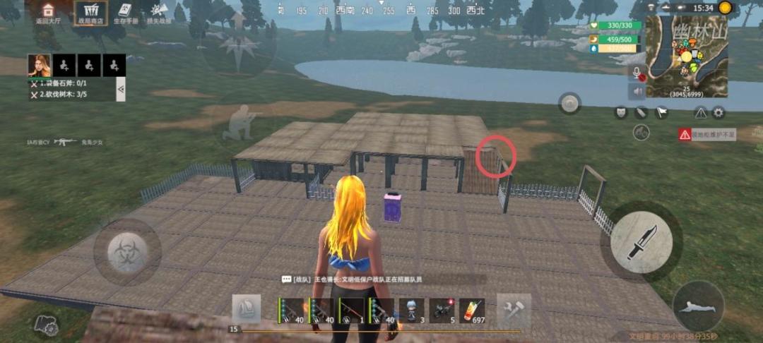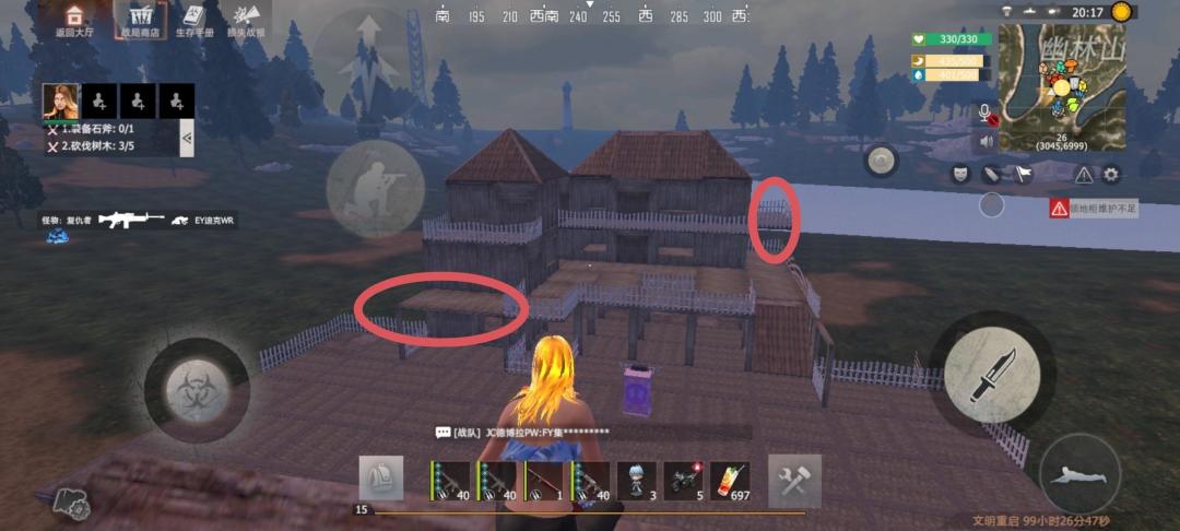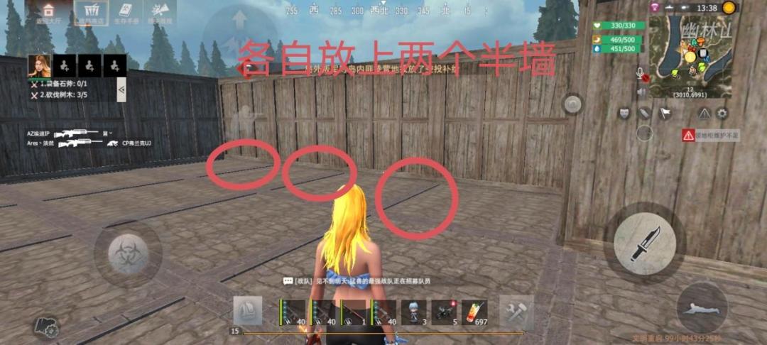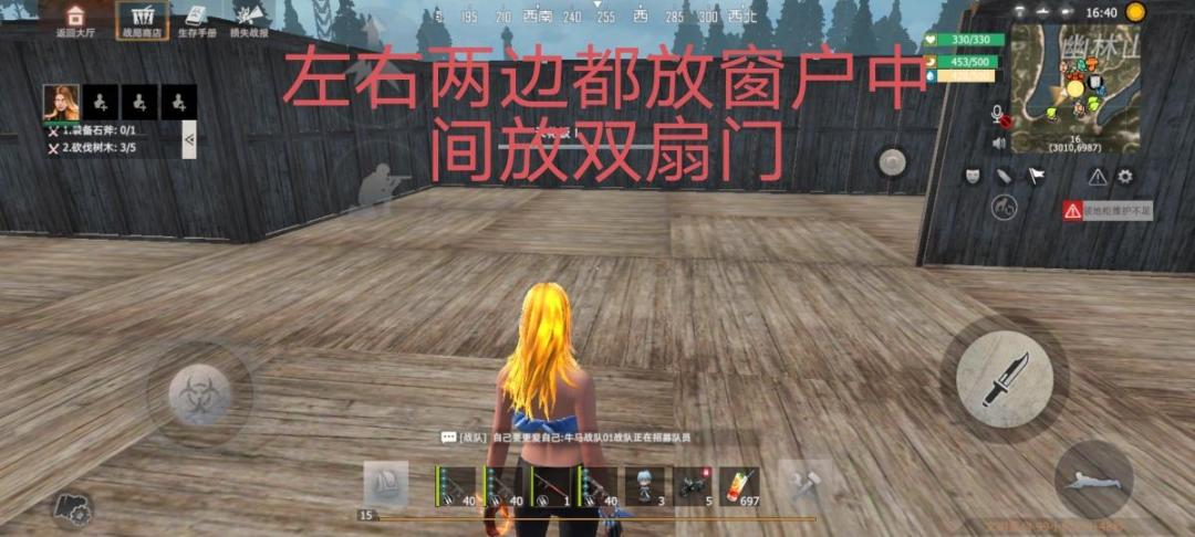 放完墙壁后,请小伙伴们,走到下图画圆圈的地方,在那个地方左边放上一扇双扇门,右边放上一个窗户 具体操作如下图
