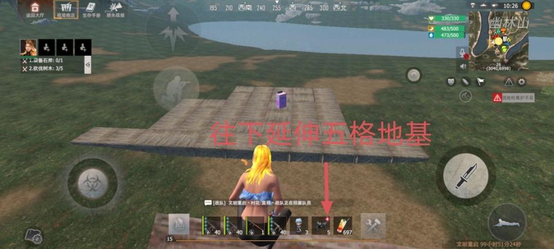 接着把那七块地基全部都往下延伸一格,然后在下图画圆圈的位置各延伸出两块地基
