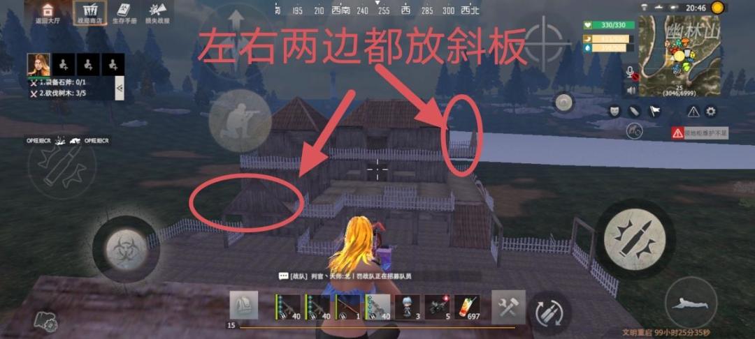 接着在下图画圆圈的地方,周围都放上墙壁,然后中间放一个上去二楼的斜板