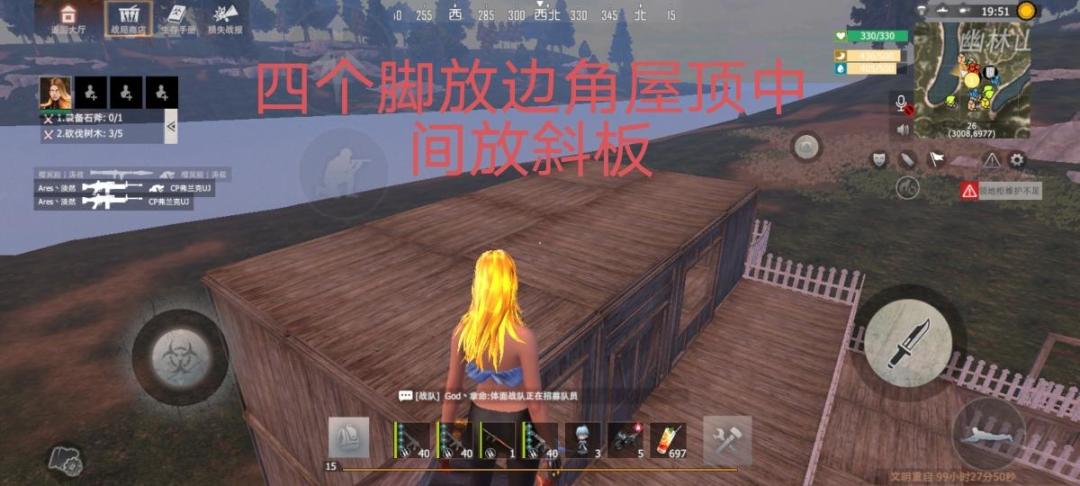 放完边角屋顶,接着小伙伴们在2×3的房里上面,把那四个角都放上边角屋顶,中间各放两块斜板