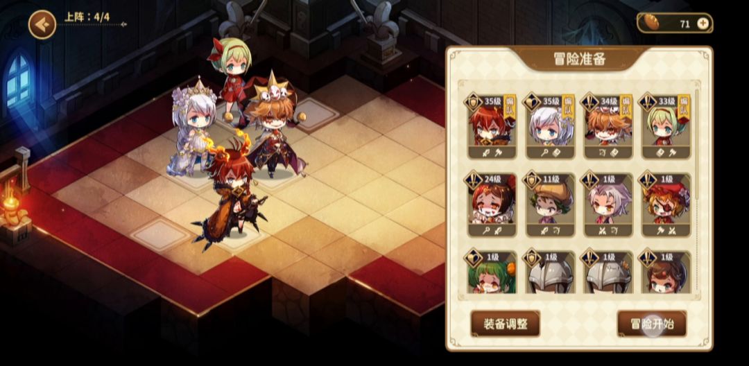 紫色玛格丽特,小丑3金,其余1金,两个35级,其余两位33.34。蘑菇不够了。首饰武器基本都是20的。视频最后有展示。