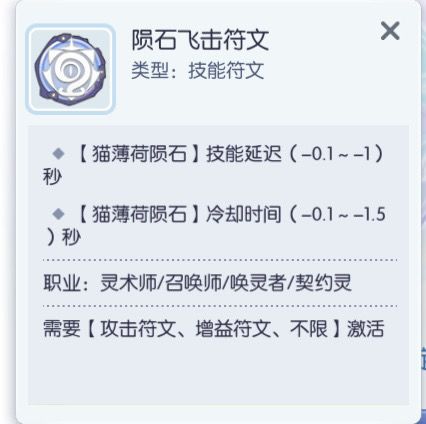 蓝色符文还是比较容易获得的,最好是冷却减少这一条越高越好,猫薄荷陨石也是法猫主要输出技能,配上满减冷却的符文猫薄荷陨石冷却只有1.5秒,配合双飞碟打出高频率伤害视觉效果不错。