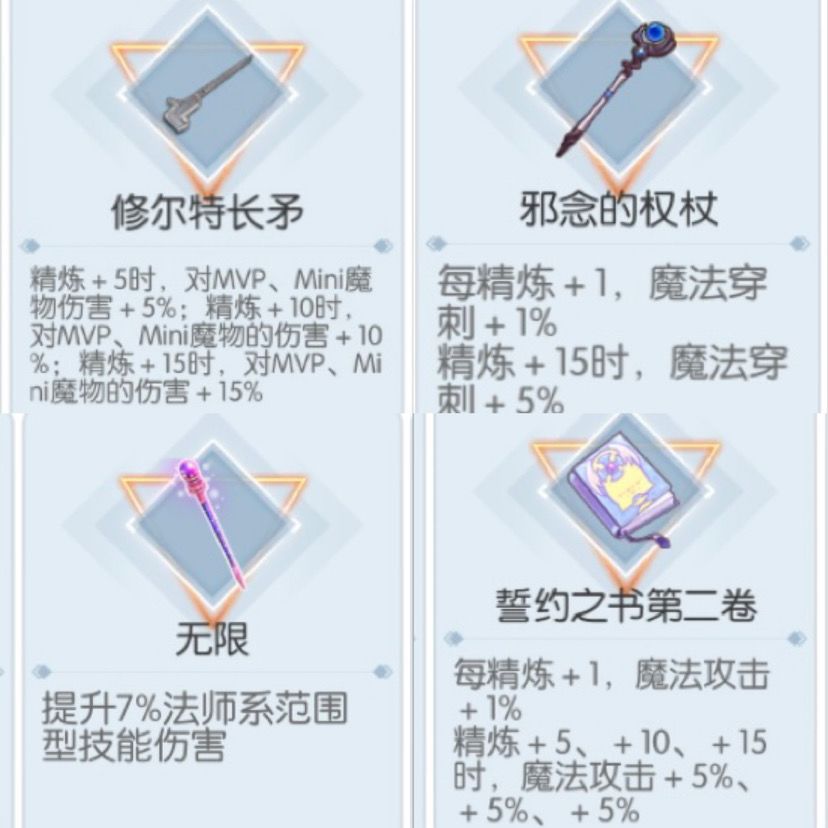 破防不够肯定是萃取大巫师补破防(PS:法猫挺缺)破防够的话以下四种任君挑选~ 修尔特长矛是首选,高额的MVP增伤,弥补了法系在这一属性方面的欠缺,邪念的话造价太高了如果搞得起也很好,无限加成太少基本就pass掉了,魔攻书经过测试,+15不如+10的修尔特长矛提升的大。