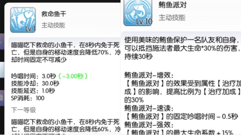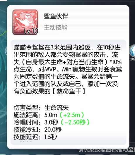 四转的鲨鱼新增了可以添加救命鱼干效果并且无副作用,配合救命鱼干可以有16秒的无敌时间,使得猫咪在生存能力方面又得到进一步提升,但鲨鱼属于地面魔法,某些清地面的副本中是会被消除的,并且该技能有0.5秒固定吟唱,有利有弊,总的来说还是利大于弊吧。
