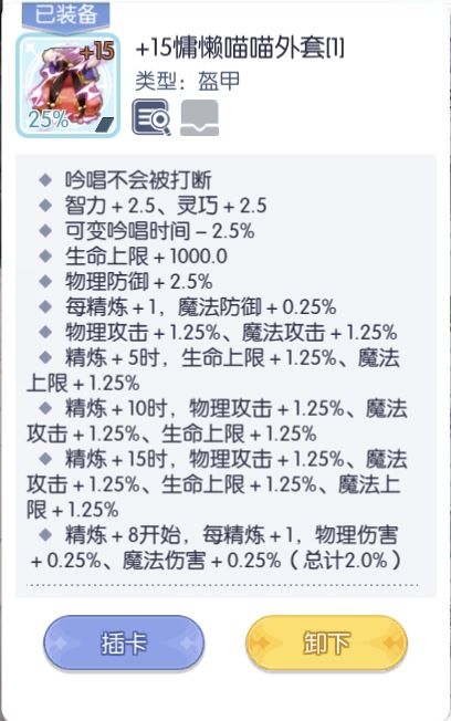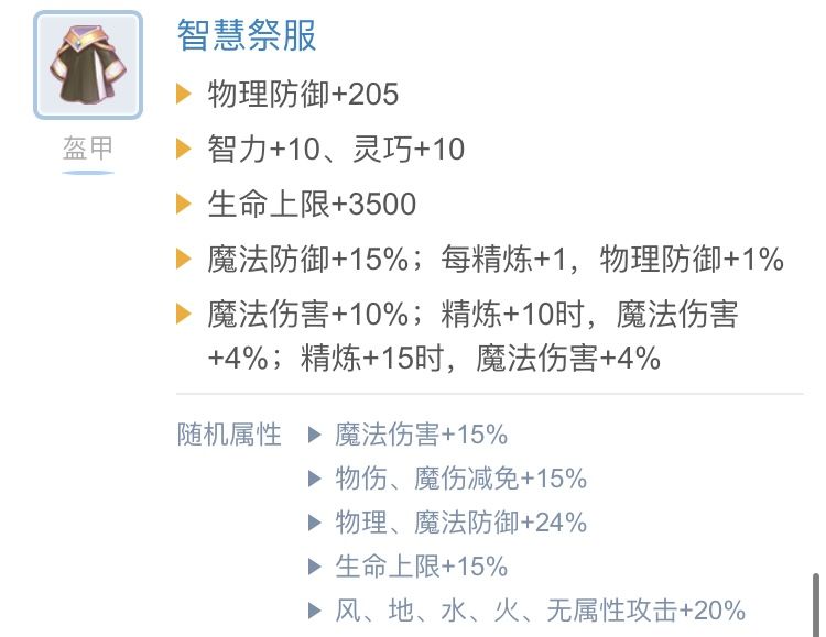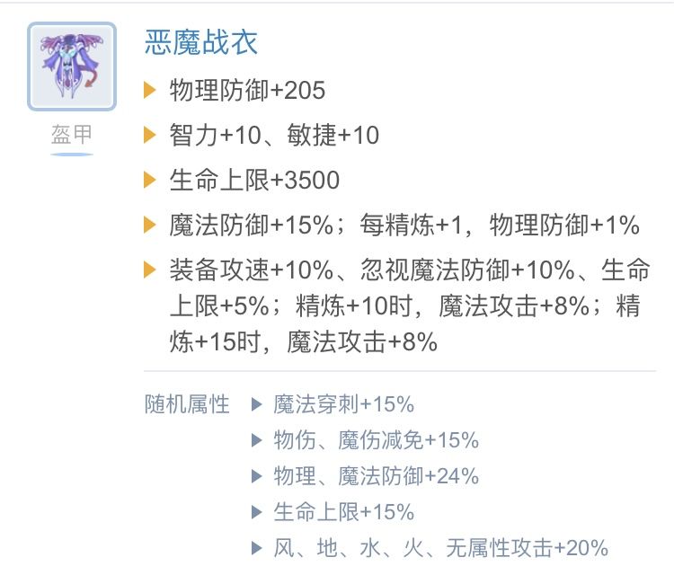 恶魔战衣这件衣服的属性很适合法猫不论随机属性是穿刺还是20%属性攻击,不过无论是木桩还是副本实战,这件衣服随机属性攻击都要优于穿刺。智慧祭服在破防足够的情况下实测输出要高于恶魔战衣,也就是目前法猫远古盔甲的最优选择,因此破防足够的话还是用智慧好一些,随机属性要20%属性攻击。