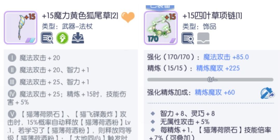 另外猫咪技能倍率低,虽然两个饰品都有加技能倍率,但是猫薄荷陨石的基础倍率只有640%,加上双饰品加成也不足1000%,使得魔法攻击的收益比较低,基础伤害低。