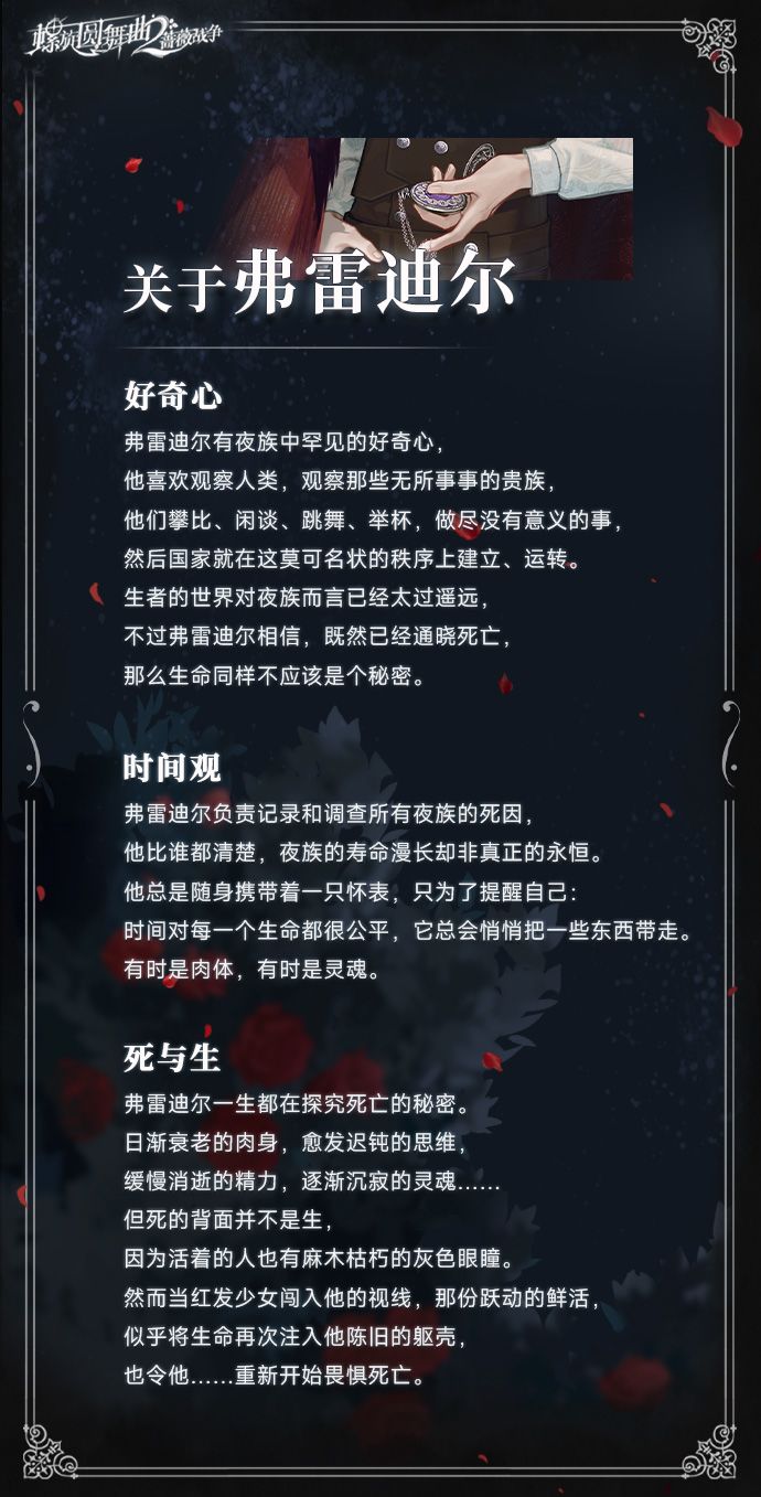 弗雷迪尔在被转化为夜族之前就是一名学者,而当他作为人类的生命结束之际,他的研究方向转向了死亡。