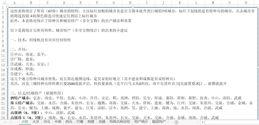 这份表格统计了所有(67座)城市的特性,大汉工作簿标红加粗的城市名是官方剧本能升到巨城的7座城市,标红下划线的是有特种兵的城市,点击城市旁的筛选按钮→按颜色筛选可快速定位到以上标红城市 此外,本表格还统计了特种兵和城市特产(非全宝物)的出产城市和效果