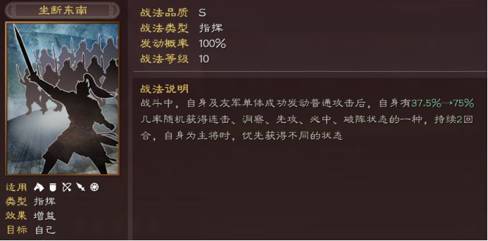 这套阵容的核心输出为孙权。孙权的战法坐断东南,战法类型为指挥战法,效果为战斗中自身及友军单体发动普通攻击后,会获得连击、洞察、先攻、必中、破阵等buff,均是在三战中较为稀有的buff。有了坐断东南后,孙权最基本的玩法便是带双突击走菜刀流了,就像我们这里选择的是一骑当千+暴戾无仁,然后又因为孙权的武力与智力都比较均衡,也可以选择带当锋摧决与兵无常势。坐断东南的缺点也是非常明显的,因为五个buff都是不能刷新效果的,而会优先获取不同的状态,对应的就是爆发不持续,时有时无。所以孙权的输出通常都很慢。当然如果想加快节奏的话也是有办法的。我们可以先给孙权挂上5个buff中的几个,然后孙权就会优先获得其他的buff。比如八门给个先攻、第二回合的兵书破阵、亦或者是凌统的先攻加必中。假设一开始就有了先攻加必中,那么孙权一出手就是连击+洞察了。