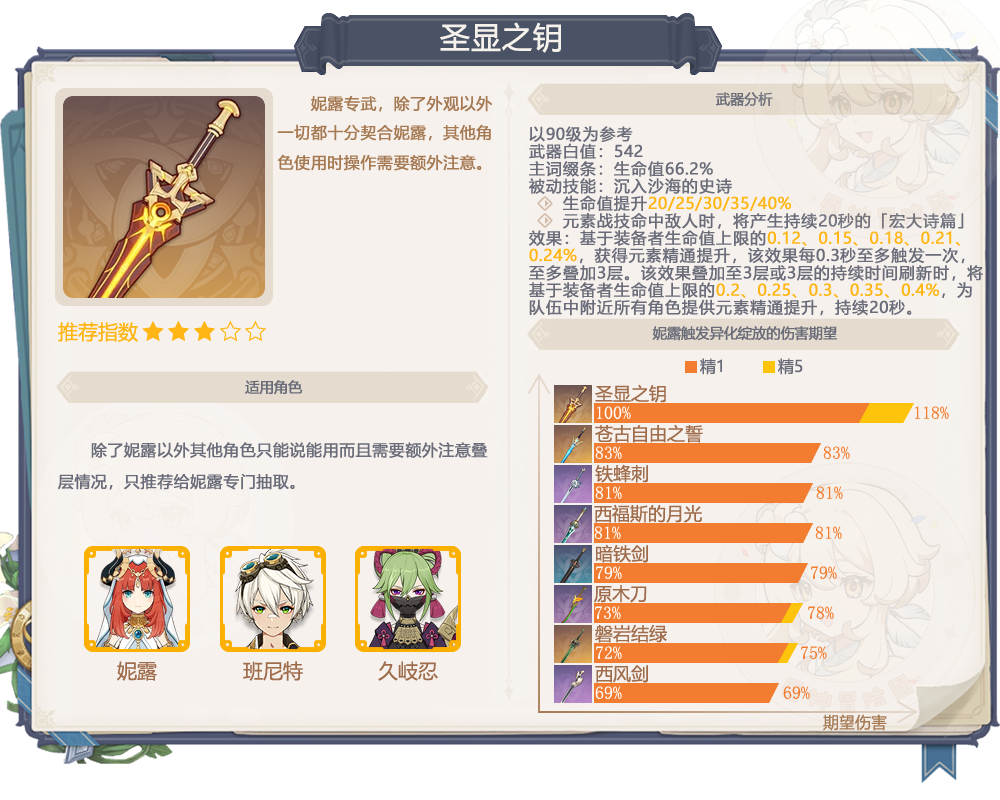 妮露使用时效果可谓一骑绝尘,效果远远超过其他武器,除了外观以外都十分适合妮露。但技能效果其他角色想要触发比较麻烦,比如班尼特携带需要开局班尼特先E打一层特效,切队友放技能,再切回班尼特后,长E一段加普攻(需要4命)或长E二段,刚好能叠3层。会影响整体流程,所以这把武器泛用性较低,并不推荐专门为其他角色抽取。