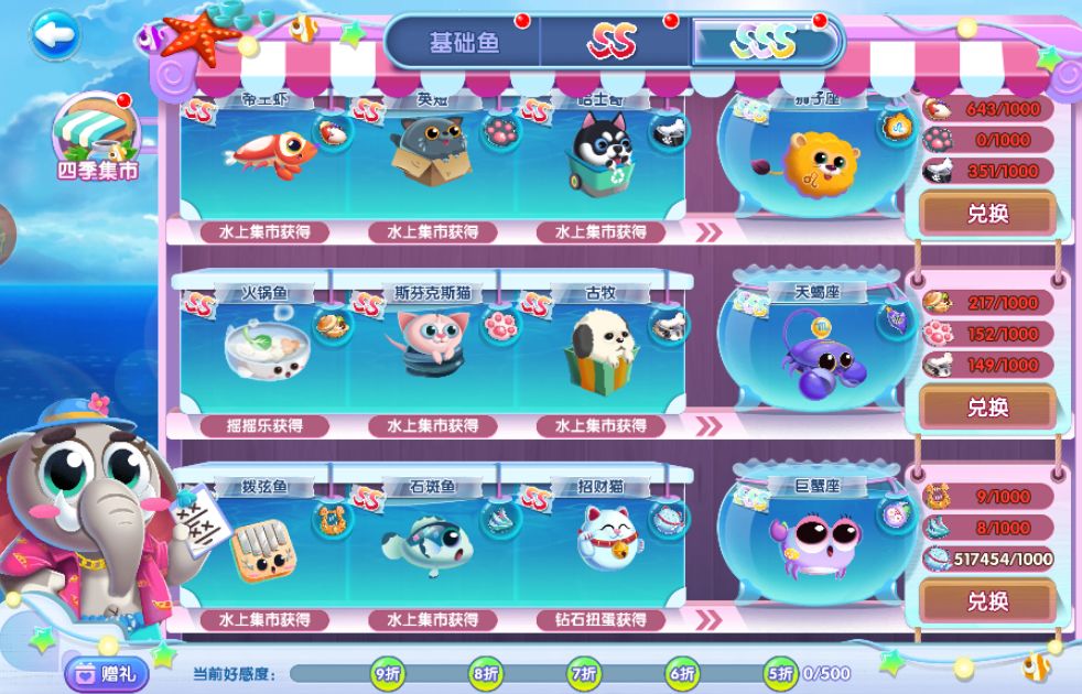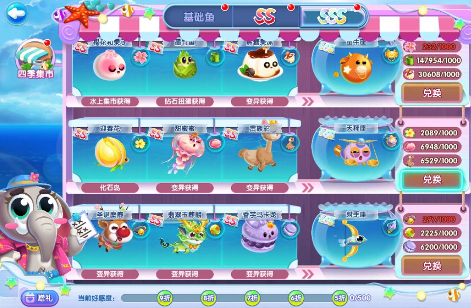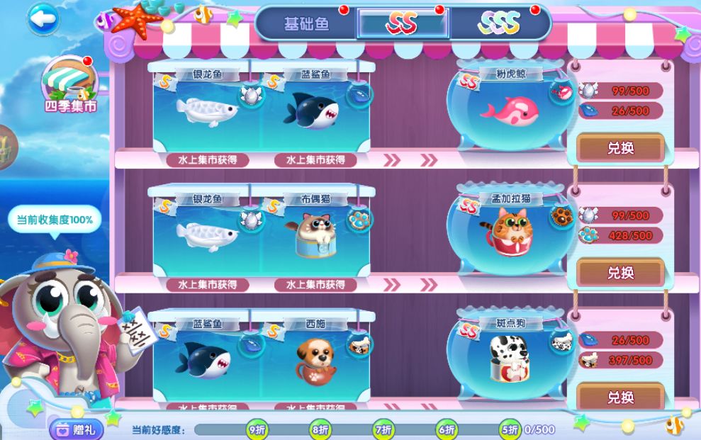到了SS页面,就需要两种S级别鱼的鱼宝去兑换SS了,最后是各500个鱼宝兑换一条SS。