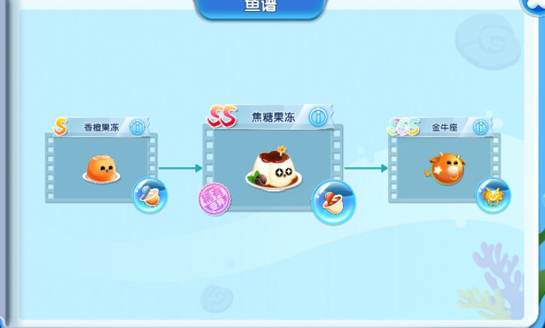 如果有子鱼是变异获得,比如焦糖果冻,可以点击焦糖果冻的图,弹出下图,就可以看到它的前置子鱼是香橙果冻,这个也不知道如何获取,那就点击香橙果冻右上角的感叹号。