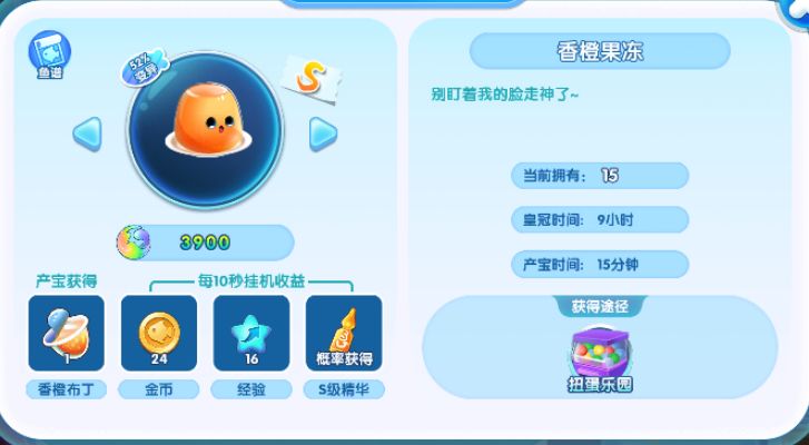 果冻,这个也是需要钻石扭蛋抽香橙果冻,然后变异出焦糖果冻,难度很大。此时可以通过在渔乐圈的集会玩法索要,SS级别每日上限2个,其次就是去好友的鱼池摸宝了,概率掉落。 第一只金牛是200个鱼宝就能换,假定一天能获取5个鱼宝,大概40天也能弄出一只金牛。