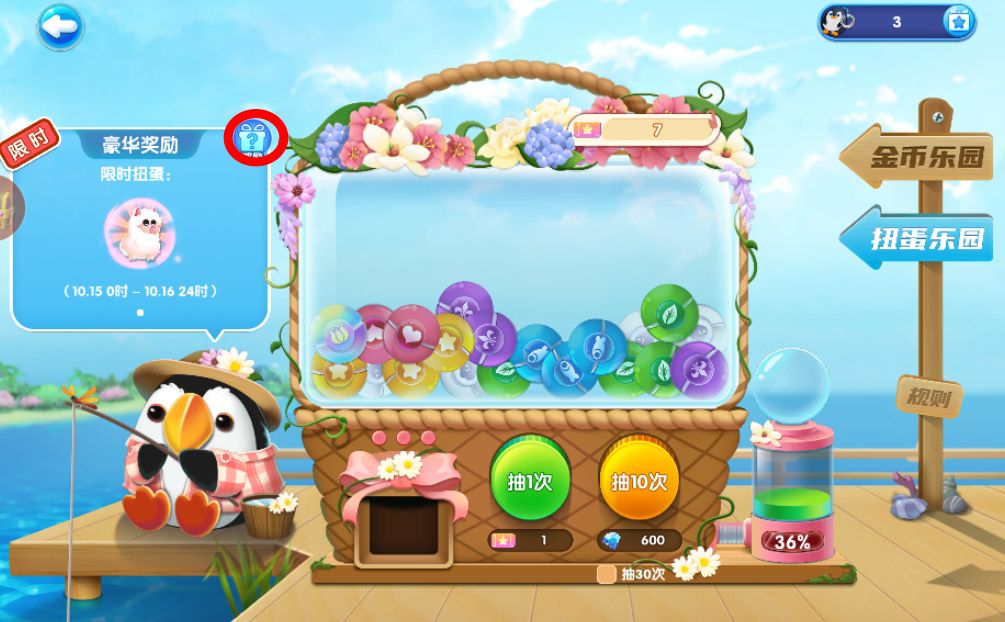 共分为两种,1是金币乐园,2是扭蛋乐园,消耗的道具不同,金币乐园消耗金币,萌新前期金币比较缺,建议不抽。扭蛋乐园则是消耗抽奖券,价值60钻一张。 点击红圈中的奖励,可以查看所有能抽到的东西。在一些节日或者特定活动的时候也会加入限时奖励,所以平时可以存着抽奖券,等待活动抽取自己想要的鱼。