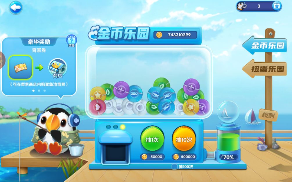 2、金币抽奖:能抽取钻石,抽奖券,电池还有很多道具,非常有用的抽奖,不过得在玩了一两月左右,才有可能有金币富裕去抽奖,前期金币还是以开鱼池为主,整个界面和玩法与扭蛋乐园类似,只是奖励变更了。