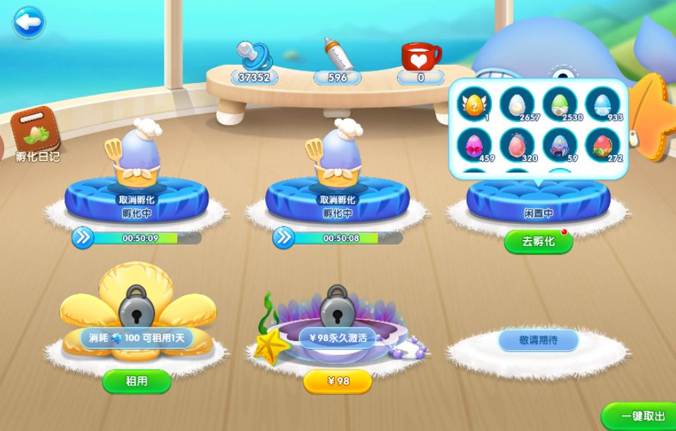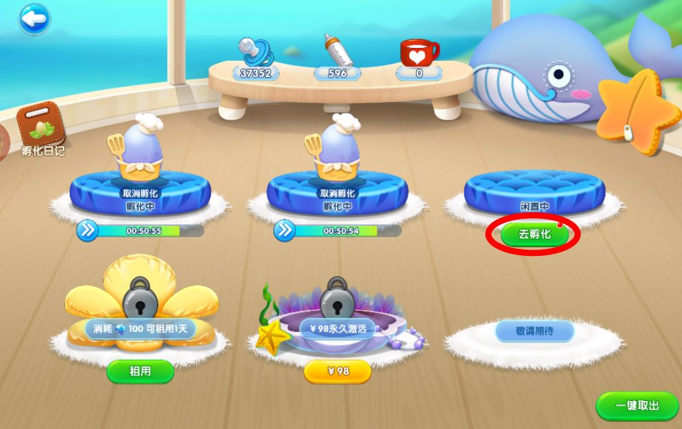 点击去孵化,即可选择想要孵化的鱼蛋进行孵化,选择后开始倒计时,每种鱼蛋需要时间不同,在倒计时结束,即可点击一键取出领取孵化的鱼。如果想要加速获取,也可以使用道具进行加速,点击倒计时左侧的箭头,可以使用加速道具。